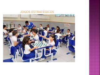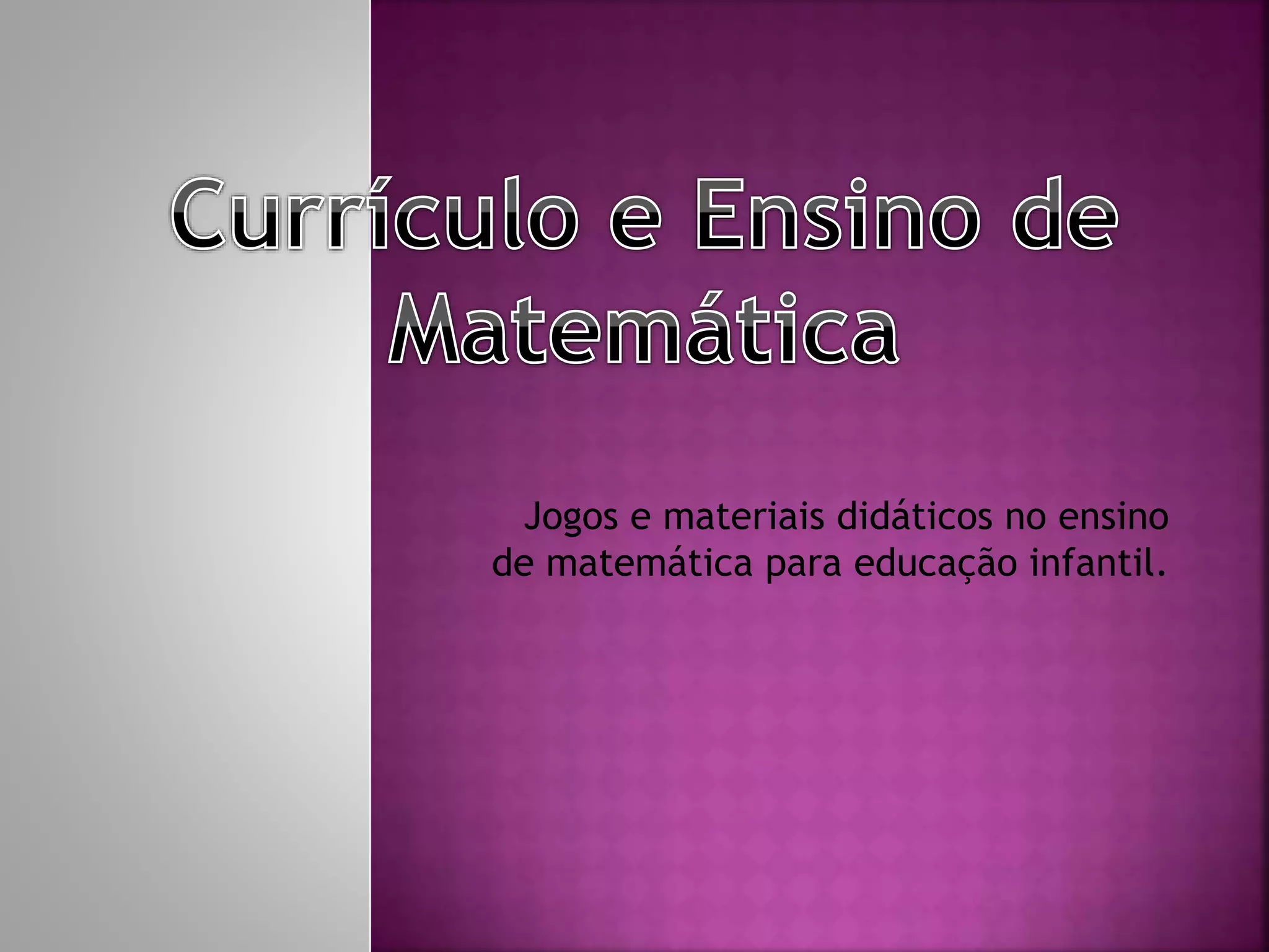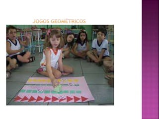 O documento discute como os jogos e materiais didáticos podem ser usados para motivar estudantes e melhorar o ensino de matemática na educação infantil, desenvolvendo habilidades como autoconfiança, organização e raciocínio lógico. Ele explica que os jogos são recursos eficazes para ensinar conceitos matemáticos de forma prazerosa e que devem ser escolhidos cuidadosamente de acordo com as necessidades dos alunos. Diferentes tipos de jogos são mencionados.