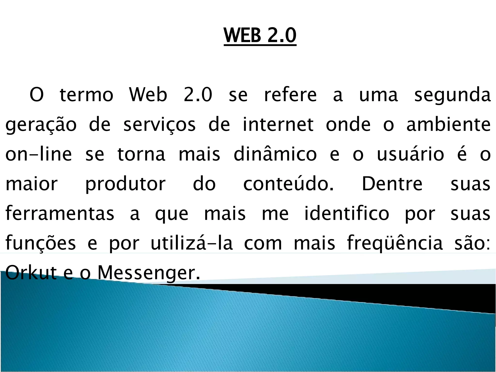 O documento descreve como o Orkut e o Messenger, ferramentas da Web 2.0, podem ser usadas para fins educacionais, permitindo que professores e alunos interajam online para tirar dúvidas e discutir assuntos da aula. Essas ferramentas também permitem que professores conheçam melhor a vida dos alunos fora da escola.