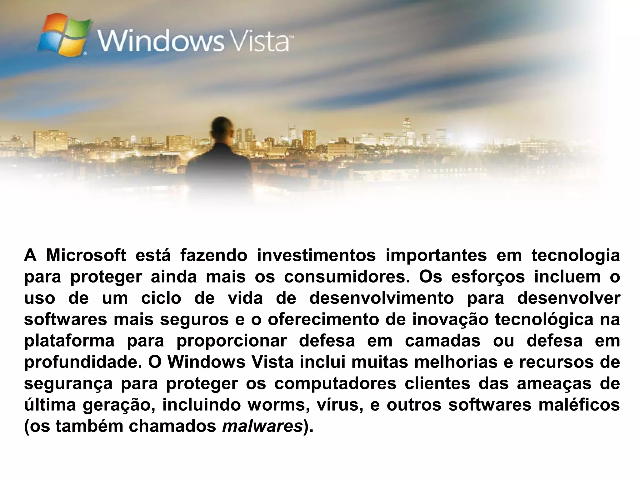 A Microsoft está investindo em tecnologias de segurança para proteger consumidores, incluindo o desenvolvimento de softwares mais seguros e inovações na plataforma Windows para fornecer proteção em camadas. O Windows Vista inclui melhorias de segurança para proteger PCs de ameaças modernas como vírus, worms e softwares maliciosos.