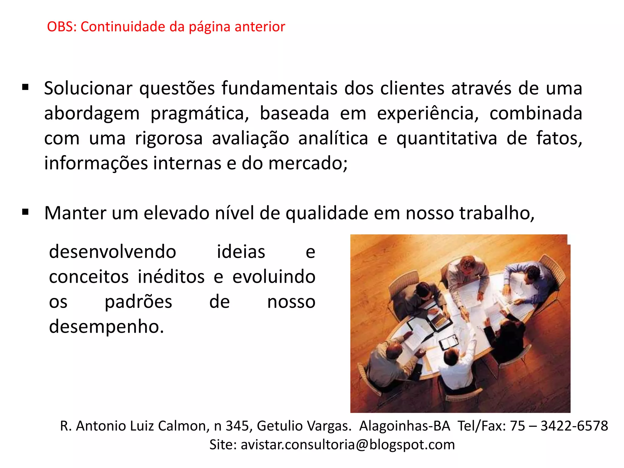 O documento discute duas questões fundamentais para os clientes: 1) solucionar questões dos clientes através de uma abordagem pragmática baseada em experiência e avaliação analítica e quantitativa; 2) manter um elevado nível de qualidade no trabalho desenvolvendo ideias inovadoras.