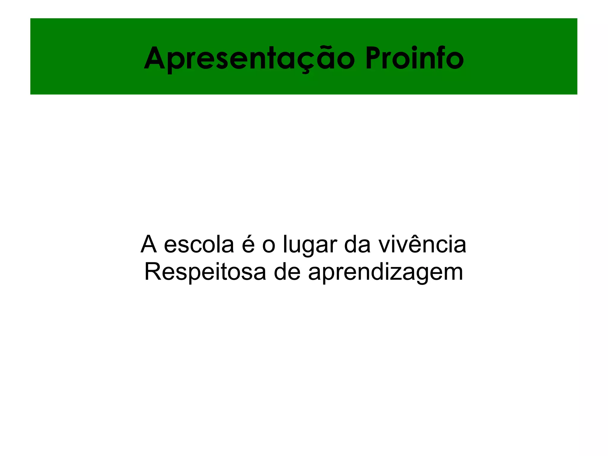 A escola é um lugar para aprendizagem respeitosa. O Proinfo fornece conteúdo educacional e ferramentas como TV Escola, mídias educacionais, Proinfantil, ProFormação e Rádio Escola para auxiliar os professores. Os valores e habilidades construídos com os alunos são apoiados pelos conteúdos educacionais.