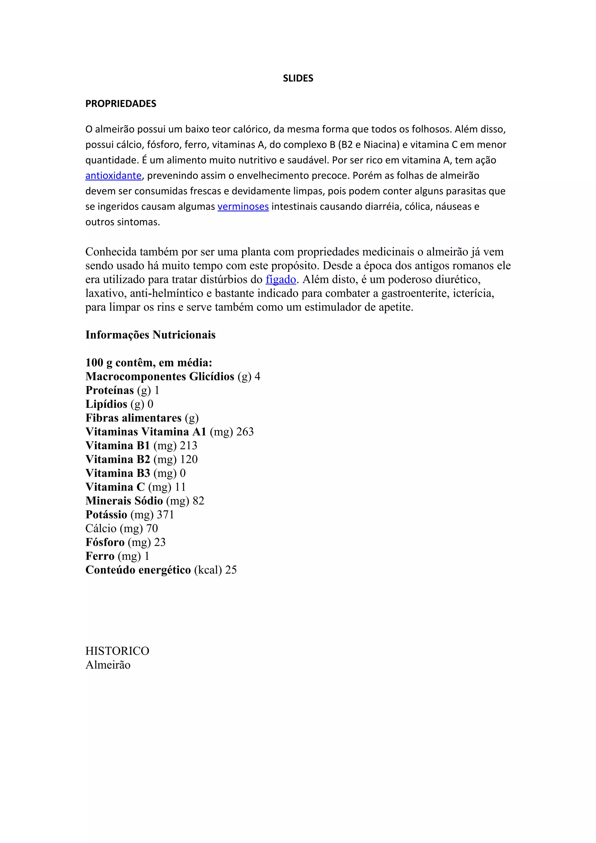 O documento fornece informações nutricionais e propriedades medicinais do almeirão. É uma planta rica em vitaminas e minerais com ação antioxidante e diurética que pode ser consumida em saladas ou pratos quentes. Deve ser consumida fresca para aproveitar seus benefícios à saúde.