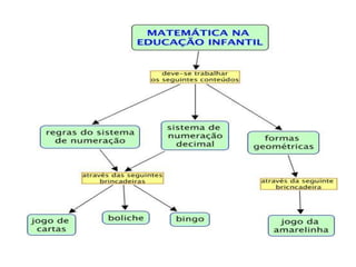 O documento discute a importância dos jogos e materiais didáticos de matemática no ensino da educação infantil, explicando que eles influenciam positivamente no desenvolvimento das crianças e as ajuda a aprender de forma lúdica e prazerosa. Alguns exemplos de jogos e materiais citados são o dominó, quebra-cabeças, amarelinha e a caixa surpresa.