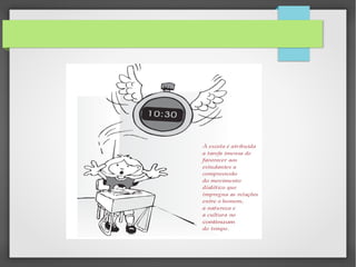 O documento discute a organização da escola para garantir o direito dos estudantes à educação de qualidade. Aborda fatores que contribuem para o sucesso escolar, como infraestrutura adequada, autonomia na gestão, formação docente, avaliação sistemática e envolvimento da comunidade. Também discute a organização das atividades escolares e o papel do Conselho Escolar na avaliação da aprendizagem.