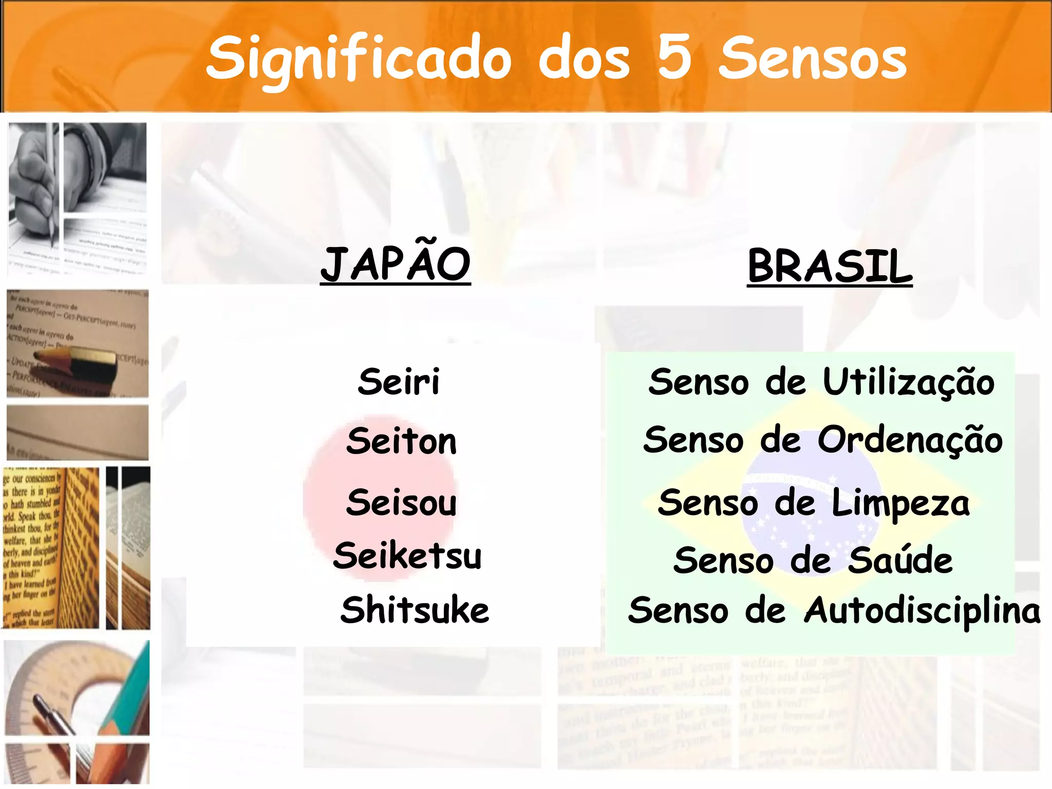 O documento aborda os 5S (Seiri, Seiton, Seisou, Seiketsu e Shitsuke), um sistema japonês de gestão para melhorar a eficiência e a organização no ambiente de trabalho e na vida pessoal, enfatizando a importância da utilização consciente de recursos, limpeza e autodisciplina. Cada senso é detalhado com seus benefícios e práticas recomendadas para uma implementação eficaz. A proposta final é a promoção de um ambiente saudável e produtivo, que estimule a criatividade e o bem-estar.