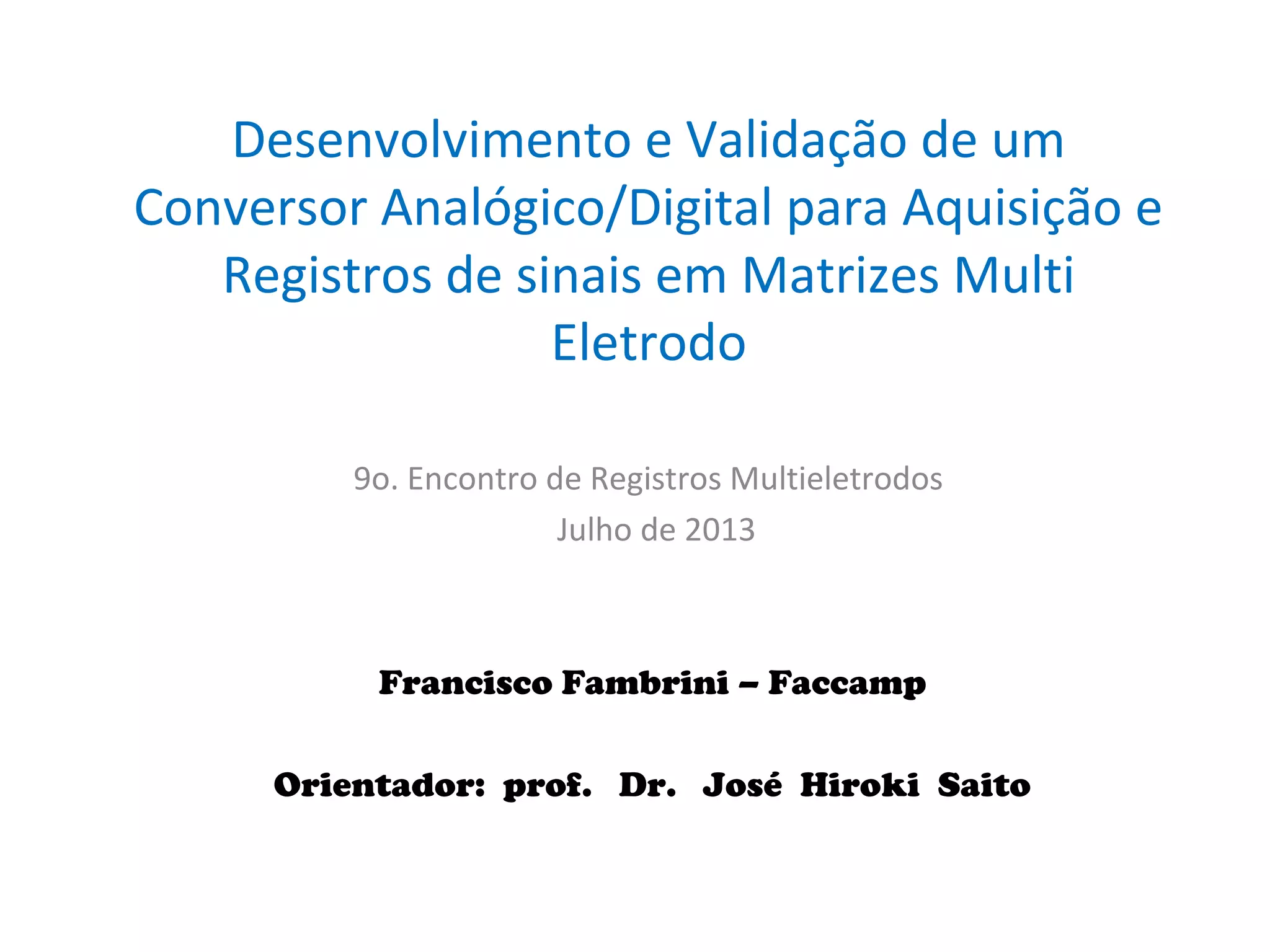 O documento descreve o desenvolvimento de um sistema de aquisição de dados para registro de sinais elétricos em matrizes multi-eletrodo. O sistema inclui um soquete, simulador, amplificador e conversor analógico-digital projetados para digitalizar sinais de baixa amplitude provenientes de eletrodos. O conversor AD inicial possui limitações e o documento discute melhorias futuras para aumentar a velocidade e resolução da aquisição de dados.