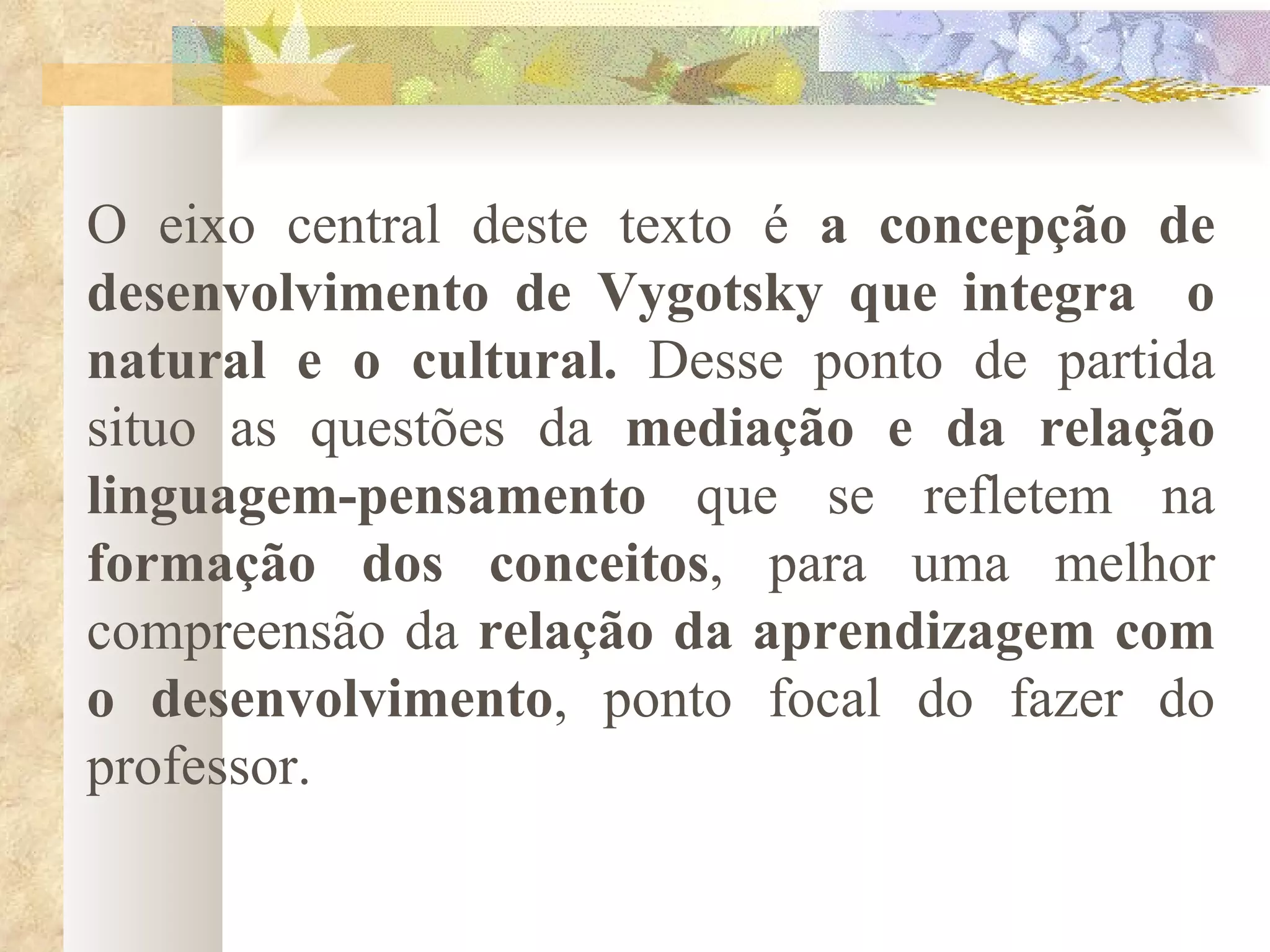 O documento discute a concepção de desenvolvimento de Vygotsky, enfatizando a importância da aprendizagem e da interação social na formação dos conceitos e no desenvolvimento das funções mentais superiores. Também aborda os conceitos espontâneos e científicos, destacando que a aprendizagem na escola permite ao aluno ascender do nível dos primeiros aos segundos.