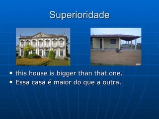O documento fornece exemplos de comparações de superioridade, igualdade e inferioridade em frases em inglês e suas traduções para o português, mostrando que essa casa é maior do que a outra, ele é mais feio do que ela, e eles são menores do que ele.