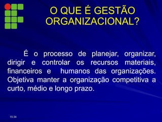 O documento discute os principais conceitos e teorias da gestão organizacional, como: