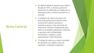 O documento discute as ideologias gerenciais que surgiram nos Estados Unidos desde a década de 1870, alternando entre retóricas racionais e normativas de controle. A primeira foi a Melhoria Industrial entre 1870-1900, seguida pela Gestão Científica entre 1900-1923 e depois pelas Relações Humanas entre 1925-1955, cada uma emergindo em resposta às críticas da anterior e em paralelo aos ciclos econômicos.