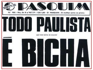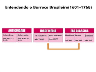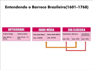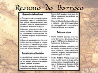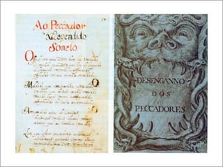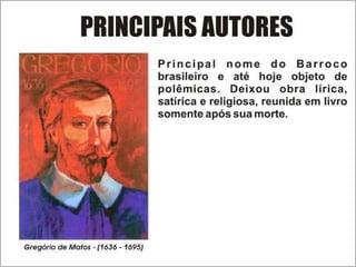 O documento resume a vida e obra do poeta barroco brasileiro Gregório de Matos e Guerra, que viveu no século XVII na Bahia. Destaca que ele escreveu poemas satíricos, amorosos e filosóficos que criticavam a sociedade da época e foi apelidado de "boca do inferno" por sua irreverência. Também inclui exemplos de seus poemas dos diferentes gêneros.