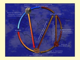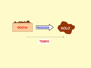 O documento descreve os processos de formação de solos e rochas, incluindo a meteorização e intemperismo de rochas, resultando na formação de solos. Detalha os principais tipos de rochas - ígneas, sedimentares e metamórficas - e seus processos de formação. Também explica os agentes de formação dos solos, como material de origem, relevo, clima, biosfera e tempo.