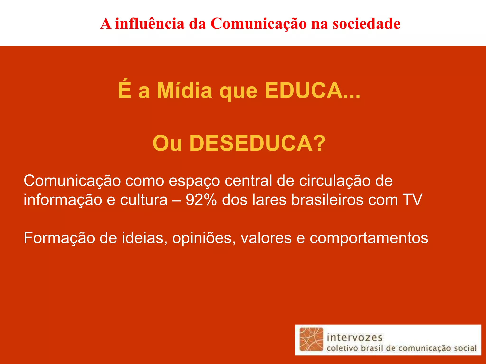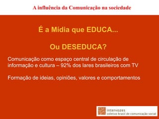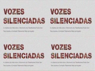 O documento discute os problemas da comunicação brasileira, incluindo concentração da mídia em poucos grupos, falta de regionalização e domínio do caráter privado-comercial. Também analisa como a mídia representa negativamente os movimentos sociais como o MST, usando termos pejorativos. Por fim, propõe soluções como fortalecer a comunicação pública, criar veículos comunitários e garantir o direito à comunicação.