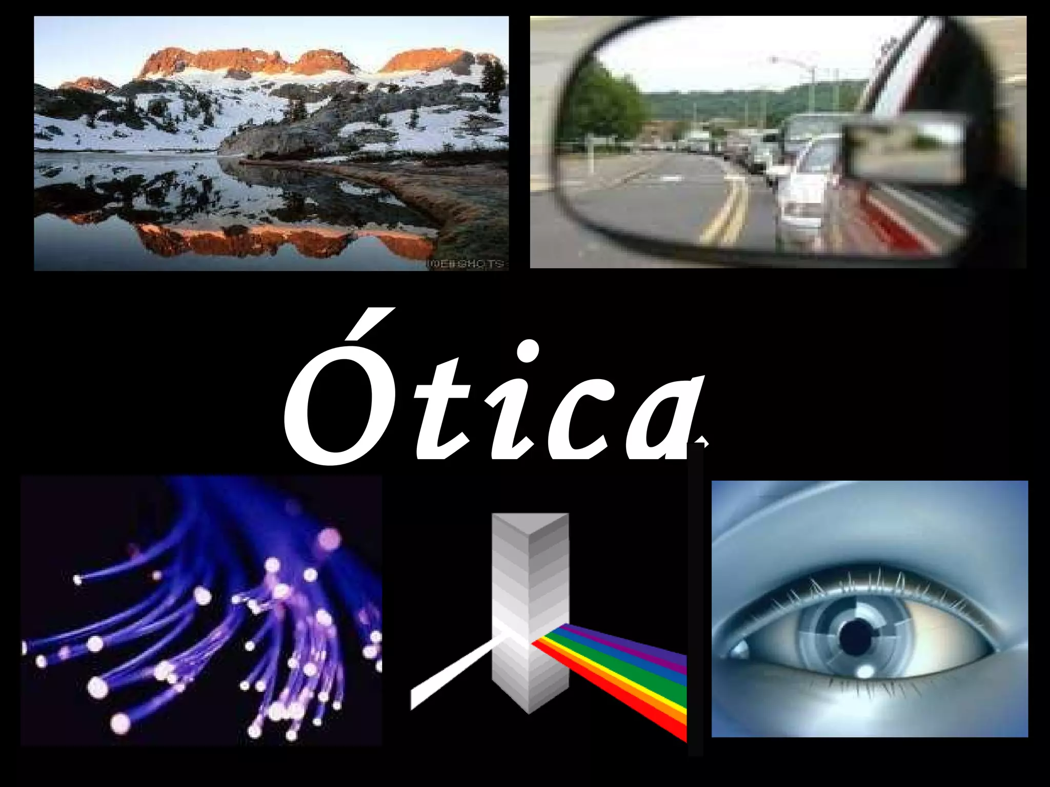 O documento discute os principais conceitos da ótica, incluindo fontes de luz, propagação da luz, reflexão, refração, absorção, espelhos, lentes e a visão humana. Ele explica como a luz se comporta ao interagir com diferentes meios e objetos, formando sombras, eclipses e imagens por meio de princípios como a propagação retilínea, independência e reversibilidade dos raios luminosos.