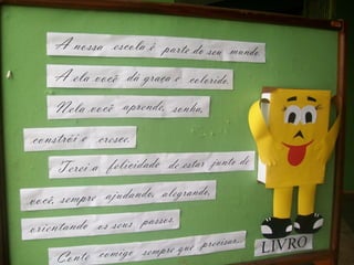 Uma escola realizou um Projeto de Leitura por uma semana com atividades como uma passarela, carrinho e varal de leitura, confecção de livros em grupo e tapete de leitura para que os alunos aprendam a ler diferentes tipos de textos com compreensão. Os professores incentivaram mais a leitura para os alunos terem acesso a diversos textos. No final, parabenizaram a todos pela participação no projeto.