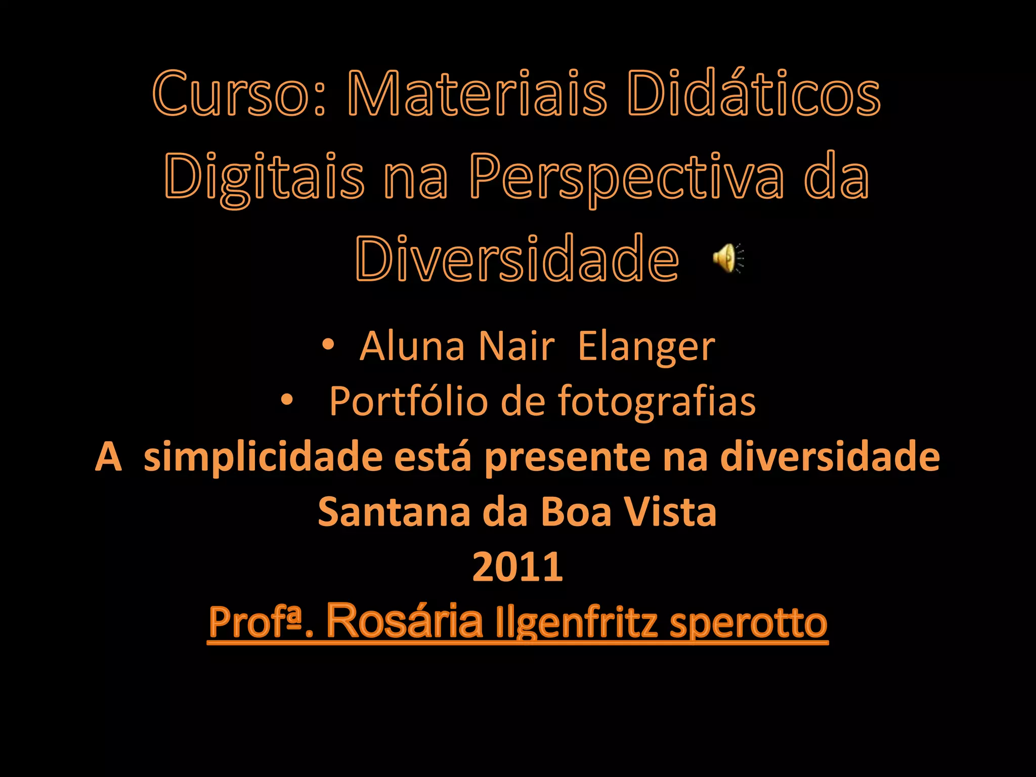 Este documento apresenta um portfólio de fotografias sobre a diversidade encontrada em Santana da Boa Vista, RS. Ele inclui links sobre o município, educação, crianças, idosos, animais e o futuro da humanidade. O portfólio foi desenvolvido por Nair Elanger para a disciplina de Materiais Didáticos Digitais sob a orientação da professora Rosária Sperotto.