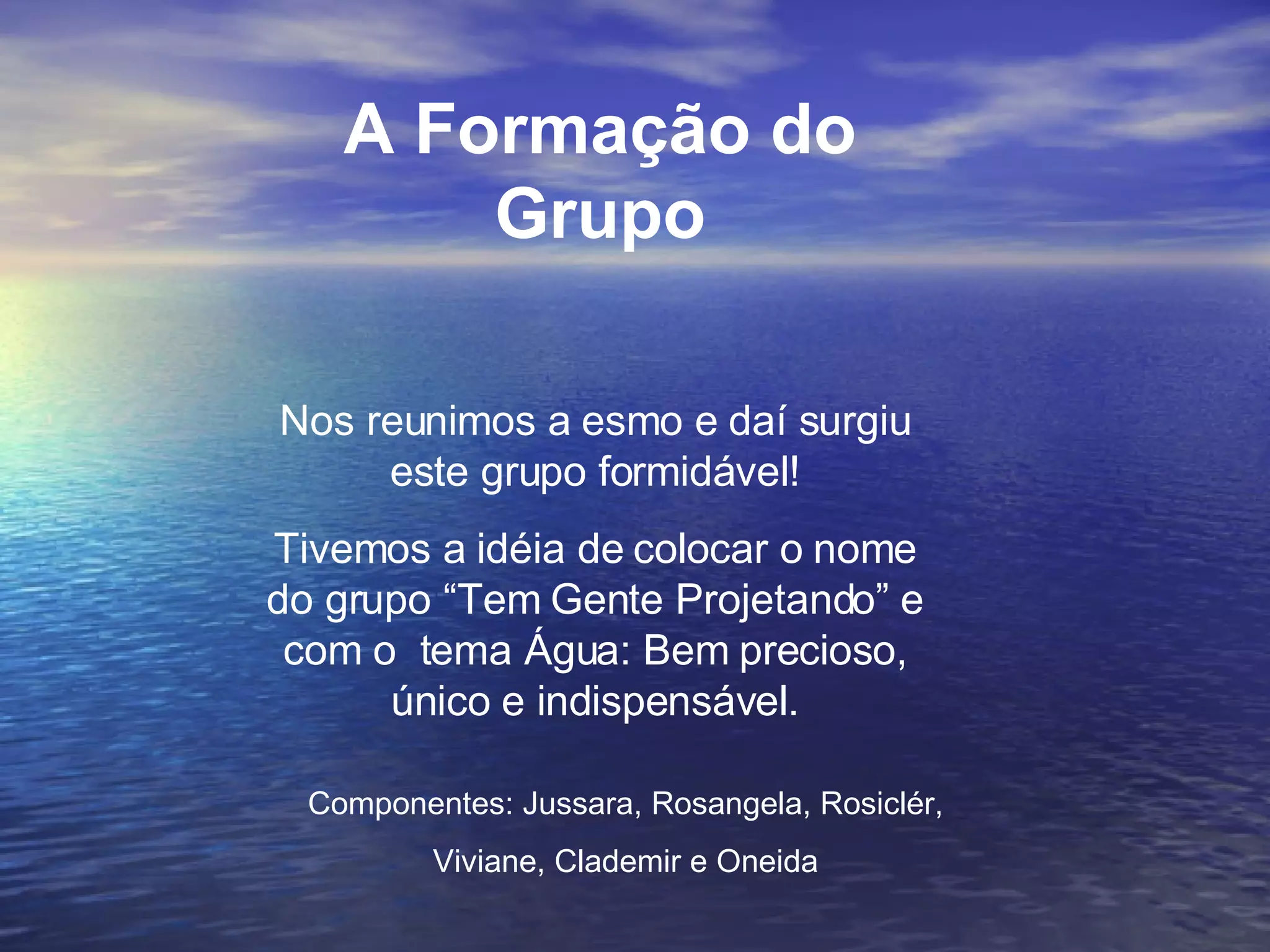O grupo "Tem Gente Projetando" foi formado para discutir a importância da água. Seu objetivo é colocar em prática ideias sobre economia de água, reutilização, não poluição e valorização da água como recurso essencial. Eles usam um blog para divulgar conteúdos como textos, vídeos e jogos com o fim de conscientizar as pessoas sobre o uso da água.