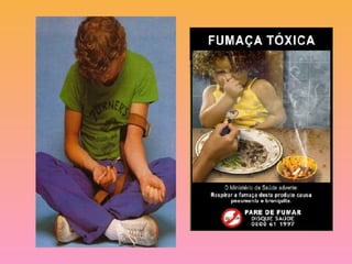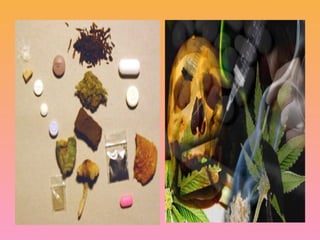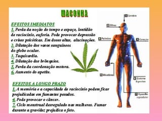 O documento discute os efeitos das drogas no corpo humano e no cérebro, classificando-as em depressoras, estimulantes e perturbadoras. Também aborda o uso de drogas por adolescentes, seus riscos à saúde como dependência química e doenças infectocontagiosas, além de apresentar os efeitos específicos de maconha, cocaína, crack e ecstasy no organismo.