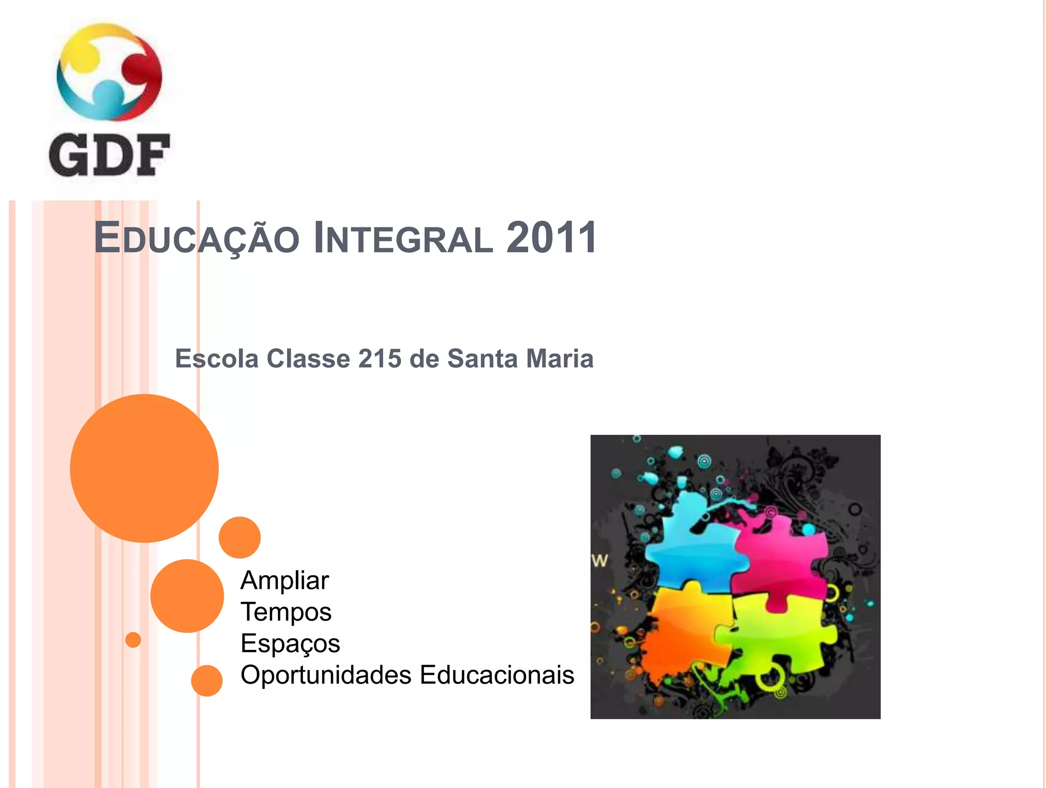 Este documento resume as atividades e resultados de um projeto de educação integral na Escola Classe 215 de Santa Maria. O projeto oferece oficinas de matemática, português, cultura, artes, esportes e valores para alunos de 3o a 4a série com dificuldades de aprendizagem ou carências socioafetivas. Os resultados incluem melhorias no rendimento escolar, interação social e desenvolvimento das aptidões dos alunos.