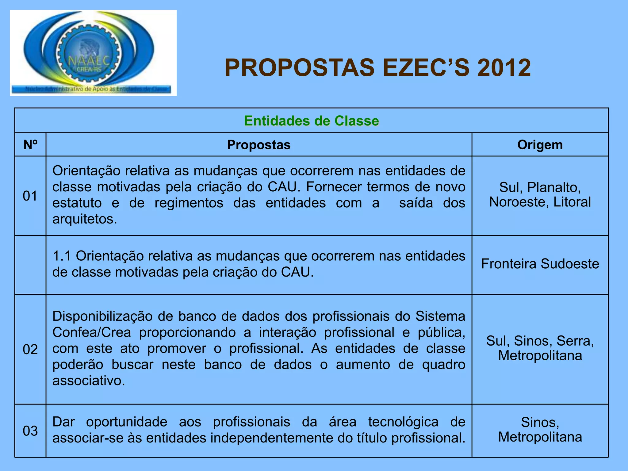 O documento apresenta 24 propostas de entidades de classe para o sistema Confea/Crea, abordando temas como mudanças nas entidades de classe com a criação do CAU, disponibilização de banco de dados de profissionais, valorização profissional e fiscalização.