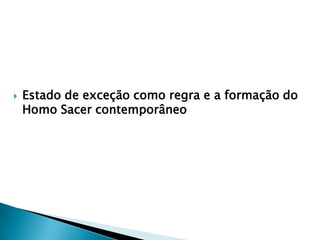 O documento discute como campos como campos de concentração e campos de refugiados funcionam como territórios, levando à perda da identidade e (des)territorialização. Referências de Agamben e Foucault são feitas sobre como tais espaços criam um "Homo Sacer contemporâneo" através do estado de exceção. Exemplos de Auschwitz, Guantánamo e campos de refugiados palestinos são dados.