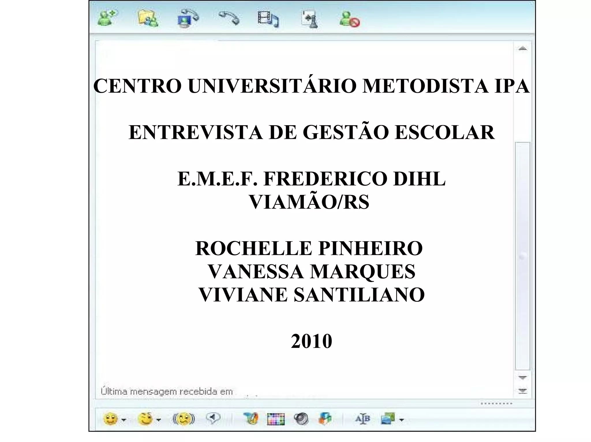 A entrevista discute os desafios da gestão escolar, como manter professores motivados e lidar com problemas sociais como drogas. A escola oferece formação continuada aos professores e está reformulando seu Plano Pedagógico para incluir acessibilidade. Conta com apoio do conselho tutelar e Ministério Público em casos de maus-tratos ou evasão, e do posto de saúde para pequenos acidentes.