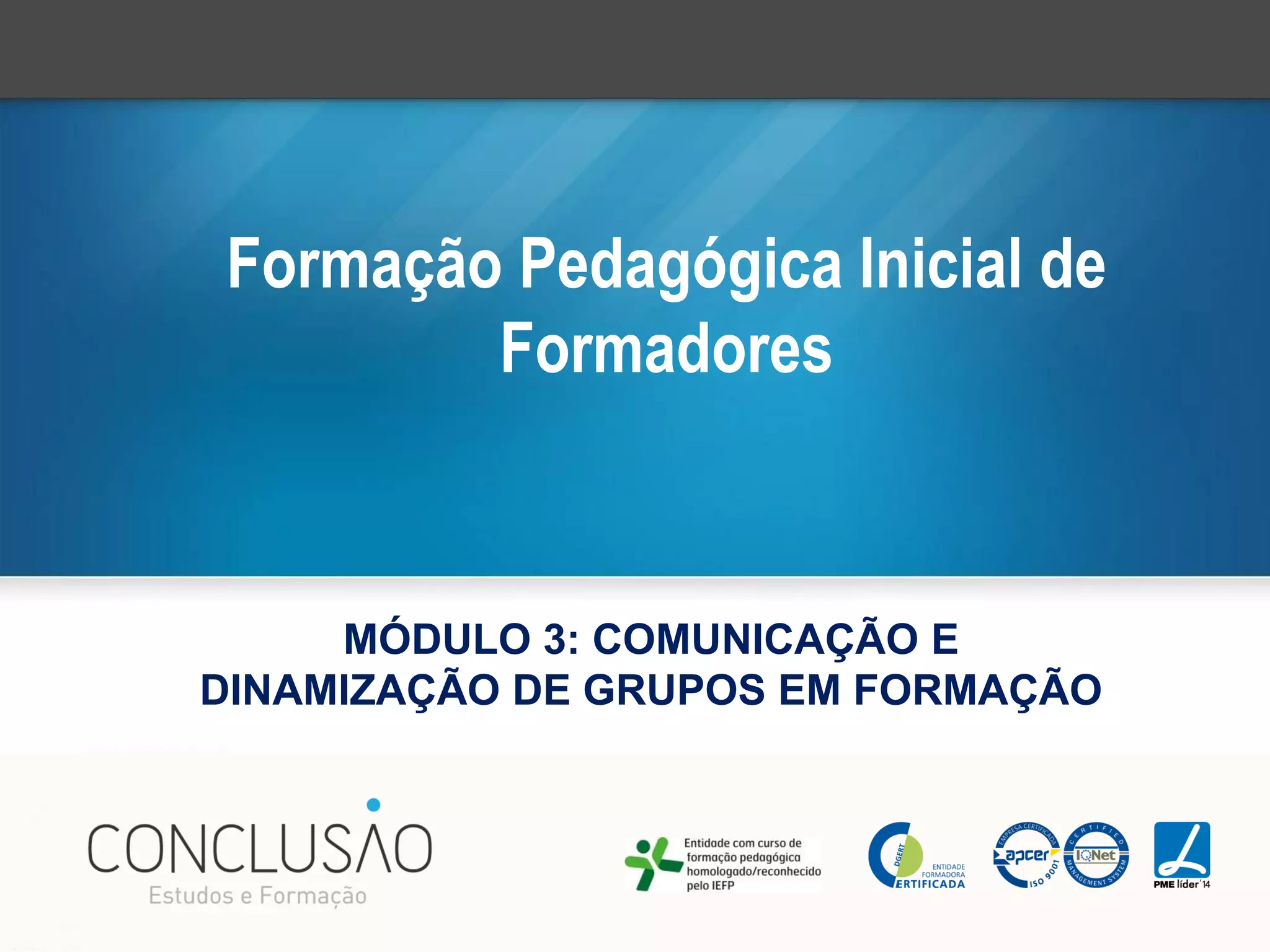 Este documento discute estratégias de comunicação e dinamização de grupos em contextos de formação. O objetivo é ajudar os formandos a compreender a dinâmica formador-formandos-objeto de aprendizagem e fenômenos psicossociais como liderança. Também aborda como gerir grupos de trabalho de forma a potencializar a aprendizagem.