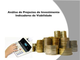 Este documento apresenta três indicadores principais para analisar a viabilidade financeira de um projeto de investimento: Valor Atual Líquido (VAL), Taxa Interna de Rendibilidade (TIR) e Período de Retorno do Investimento (PRI). O VAL calcula o valor presente dos fluxos de caixa de um projeto, a TIR é a taxa que iguala o VAL a zero, e o PRI é o tempo para recuperar o investimento inicial.