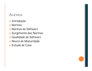 O documento discute a melhoria do processo de software no Brasil através da adoção de normas e níveis de maturidade. Ele introduz normas de software e qualidade, explica os níveis de maturidade do MPS-BR de G a A, e apresenta um estudo de caso da implementação do MPS-BR na empresa Clic Interativa.