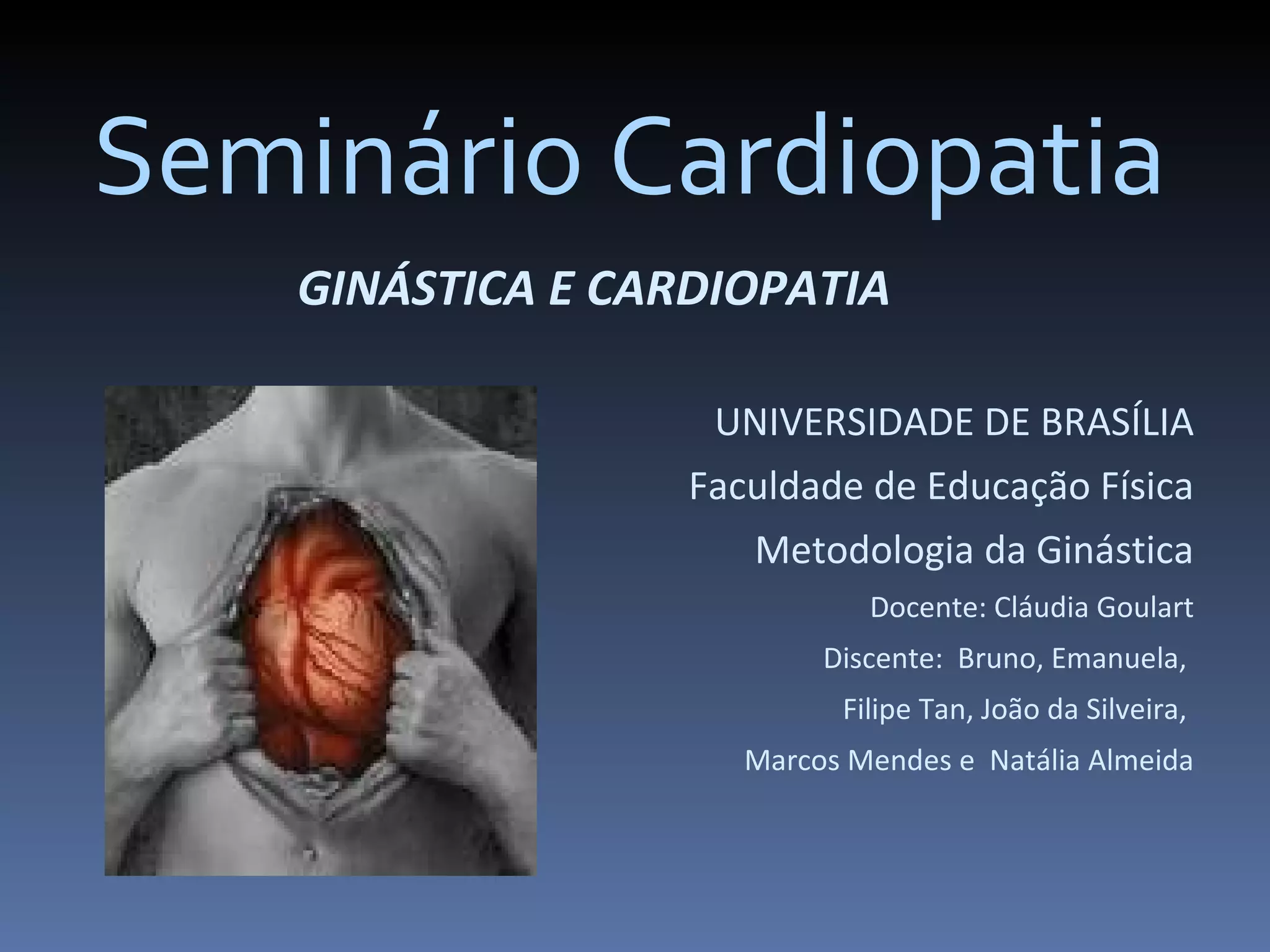 O documento discute como a ginástica pode beneficiar pessoas com cardiopatias. Apresenta os principais tipos de cardiopatia e fatores de risco, além de explicar como a atividade física regular pode melhorar a saúde cardiovascular reduzindo a pressão arterial, os níveis de colesterol e gordura corporal.