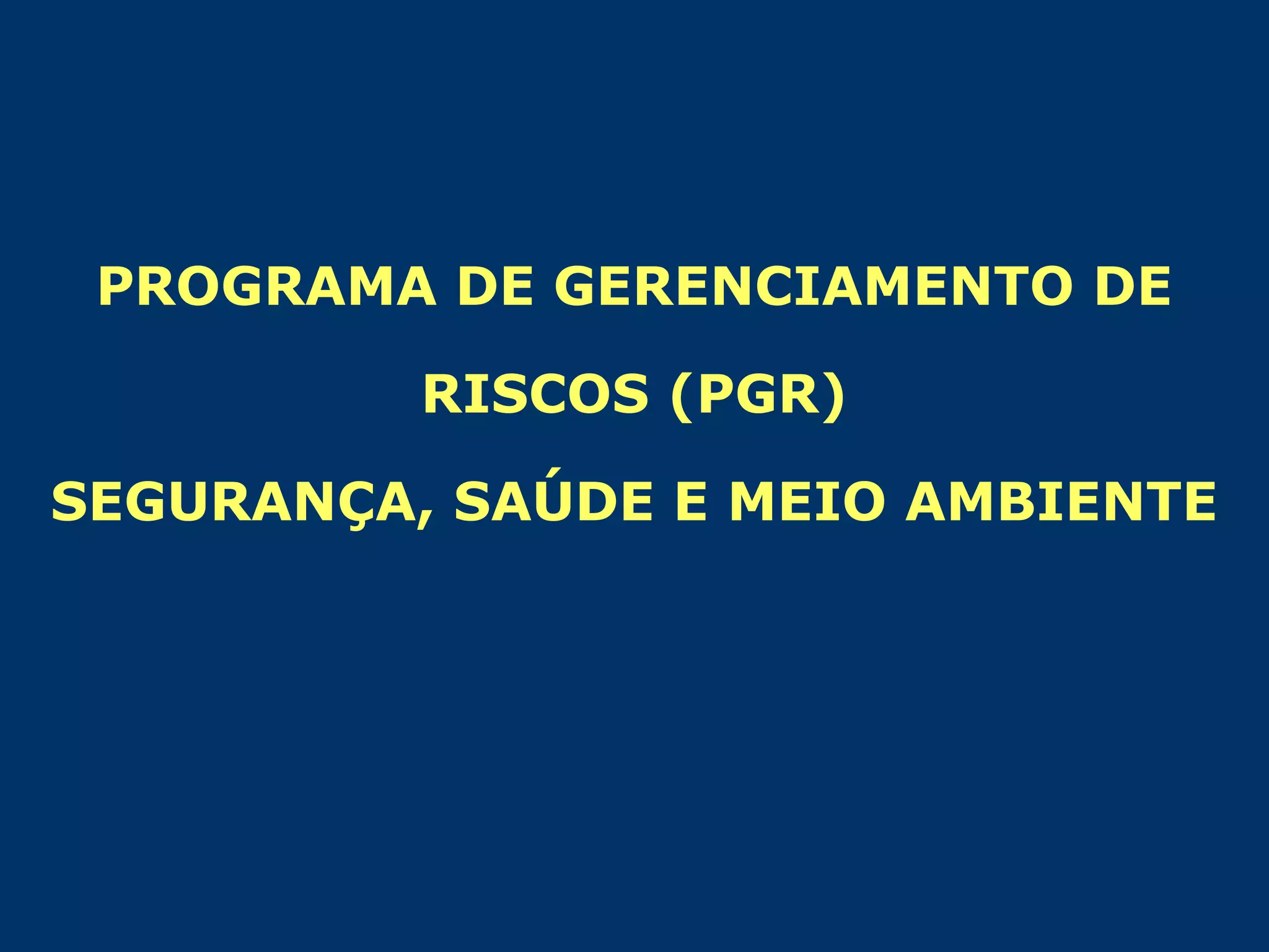 O documento apresenta o Programa de Gerenciamento de Riscos de uma organização, com o objetivo de manter ambientes de trabalho saudáveis e preservar o meio ambiente. Ele também visa manter a conformidade com as Normas Regulamentadoras e legislação trabalhista, listando várias NRs como NR1, NR4, NR7 e NR18.