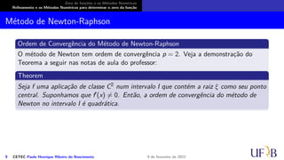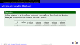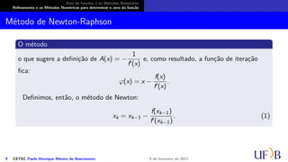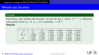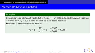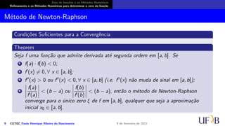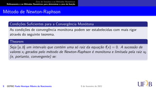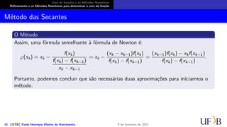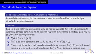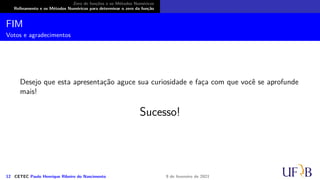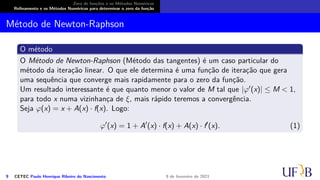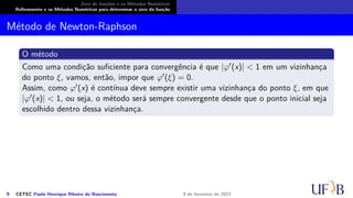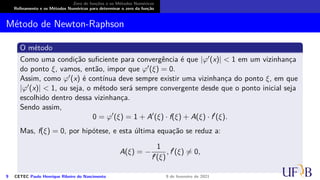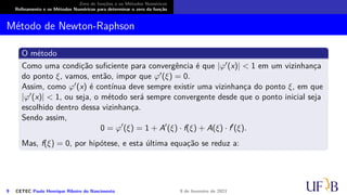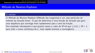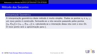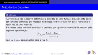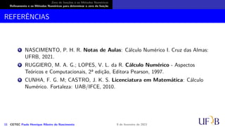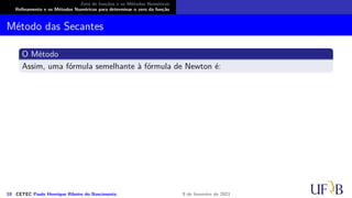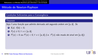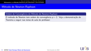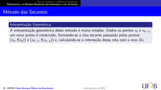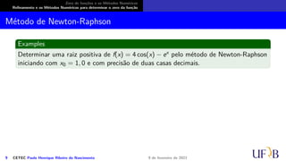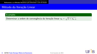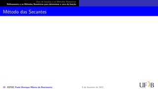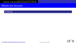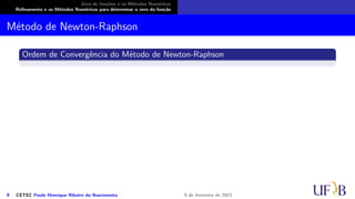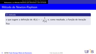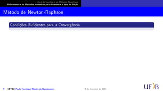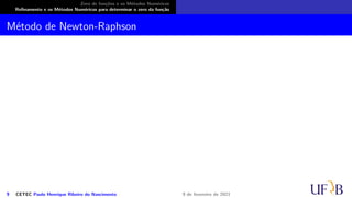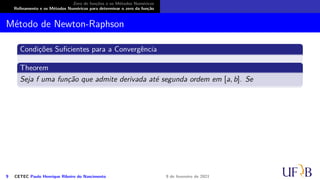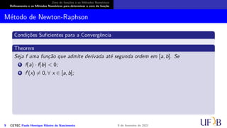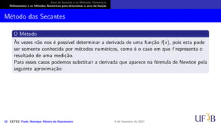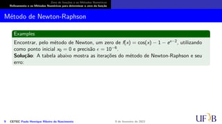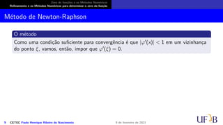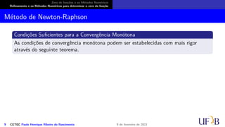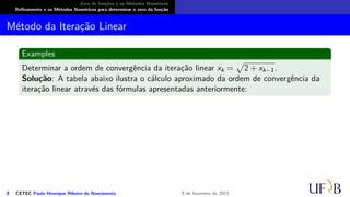 O documento discute métodos numéricos para determinar o zero de uma função. Ele explica que os métodos numéricos determinam uma sequência aproximada que converge para o zero, enquanto métodos analíticos fornecem soluções exatas. Além disso, descreve duas fases dos métodos numéricos: isolamento dos intervalos contendo cada zero e refinamento das aproximações.