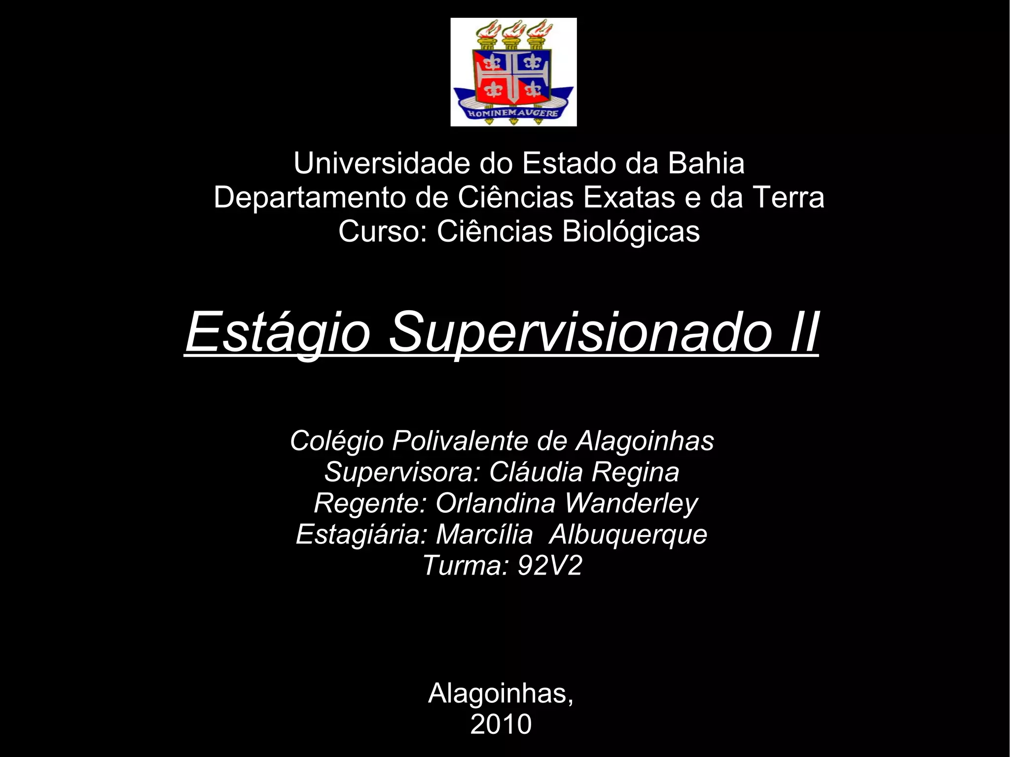 Este documento resume o estágio supervisionado de Marcília Albuquerque no Colégio Polivalente de Alagoinhas. O estágio incluiu 3 semanas de observação, 4 semanas ministrando aulas durante o período letivo e 1 semana para aplicação de provas. A estagiária utilizou diversas técnicas pedagógicas como aulas expositivas, exercícios, pesquisas e avaliações. Ela recebeu nota 9,0 da professora orientadora e se autoavaliou com 9,5.