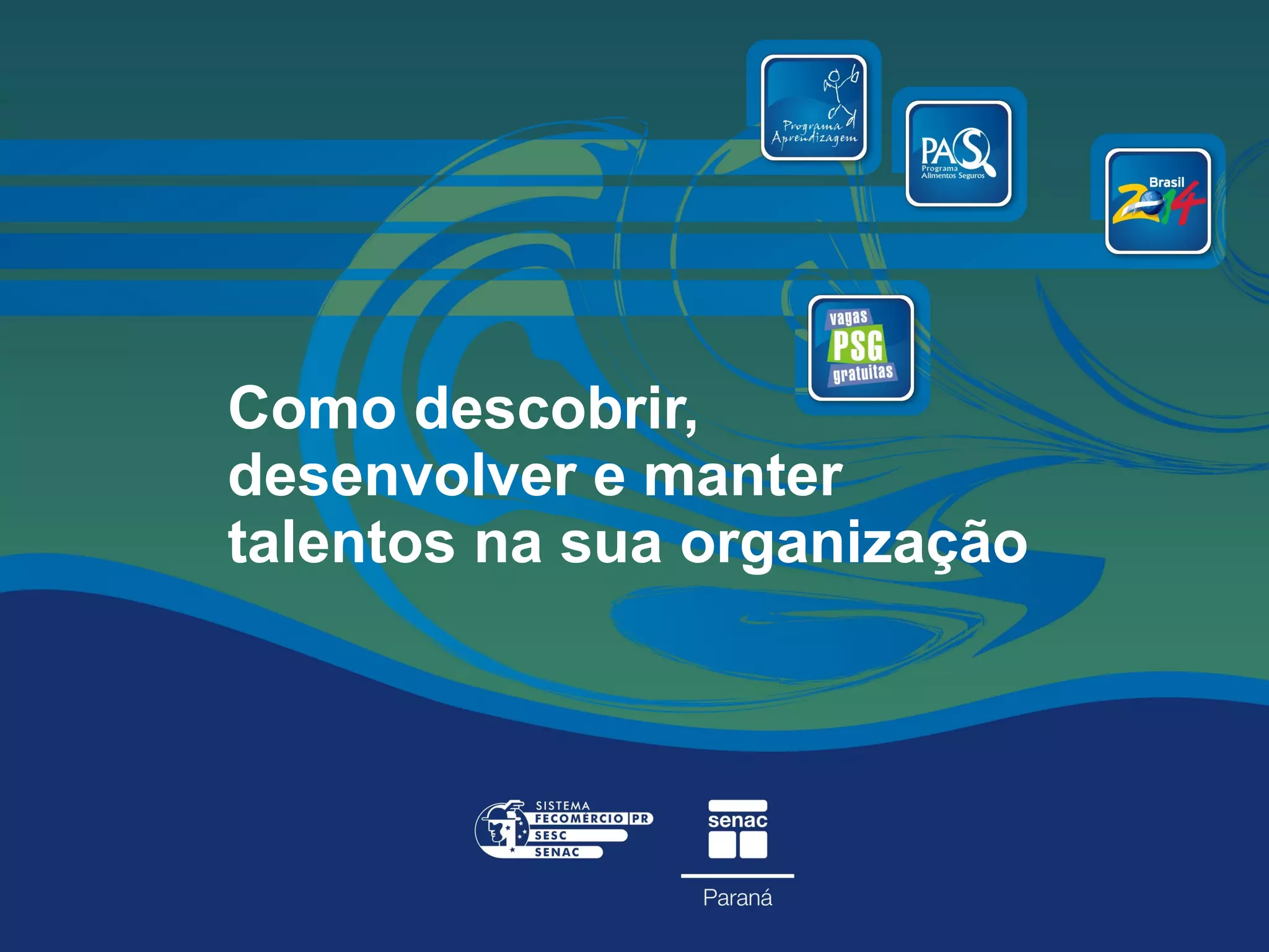 O documento discute a importância de identificar, desenvolver e manter talentos na organização para inovar e conquistar novos mercados. Aprendizagem individual e organizacional são essenciais para o sucesso das empresas. O Senac pode ajudar por meio de cursos de educação profissional, identificando competências e oferecendo qualificação.
