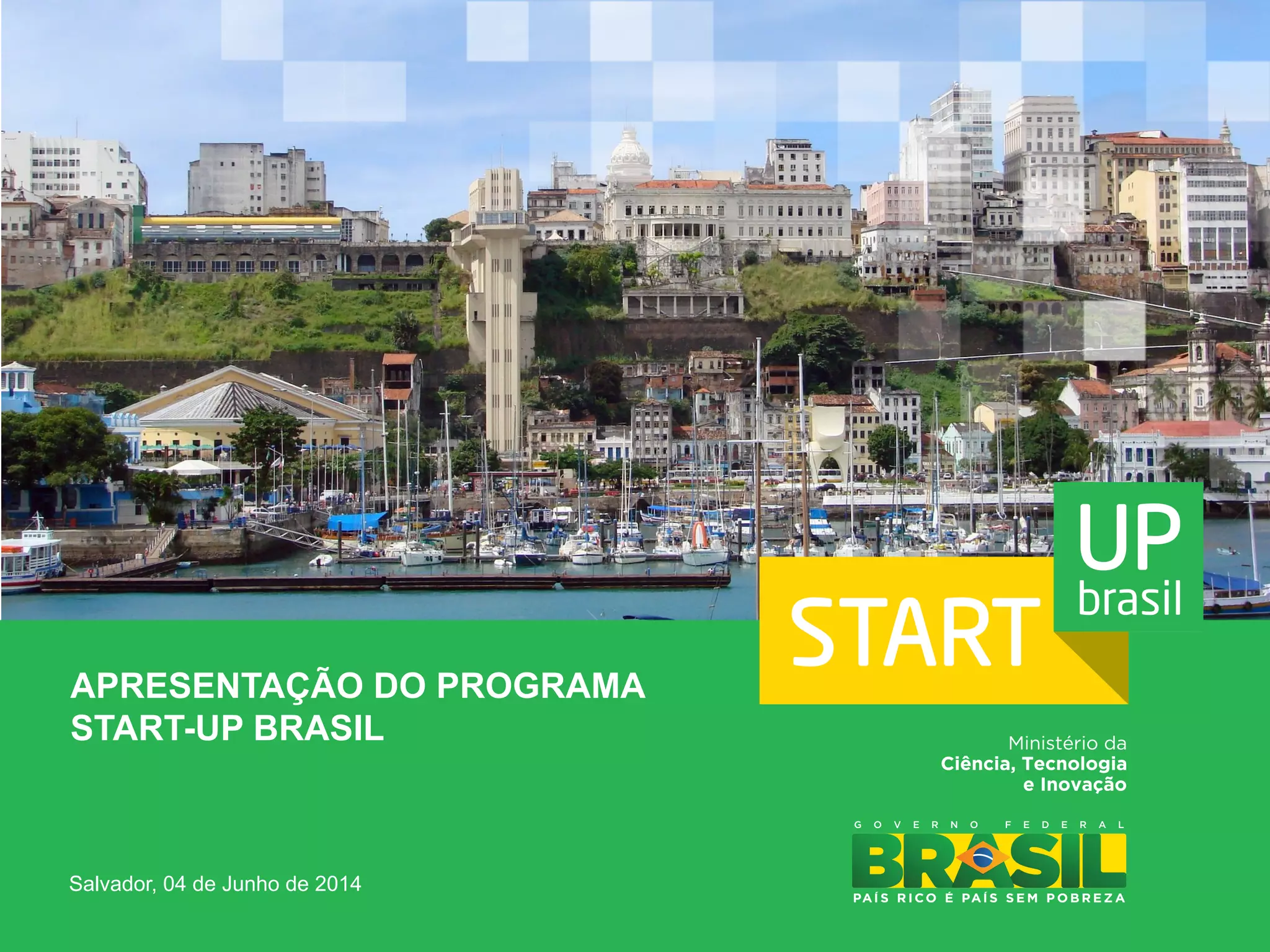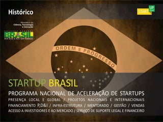 O documento apresenta o programa Start-Up Brasil, que apoia o desenvolvimento de startups no país. O programa fornece até R$200 mil em bolsas por 12 meses para 100 startups selecionadas a cada semestre e as conecta com 12 aceleradoras privadas. Também oferece eventos de capacitação, acesso a mercados e rede internacional de apoio.