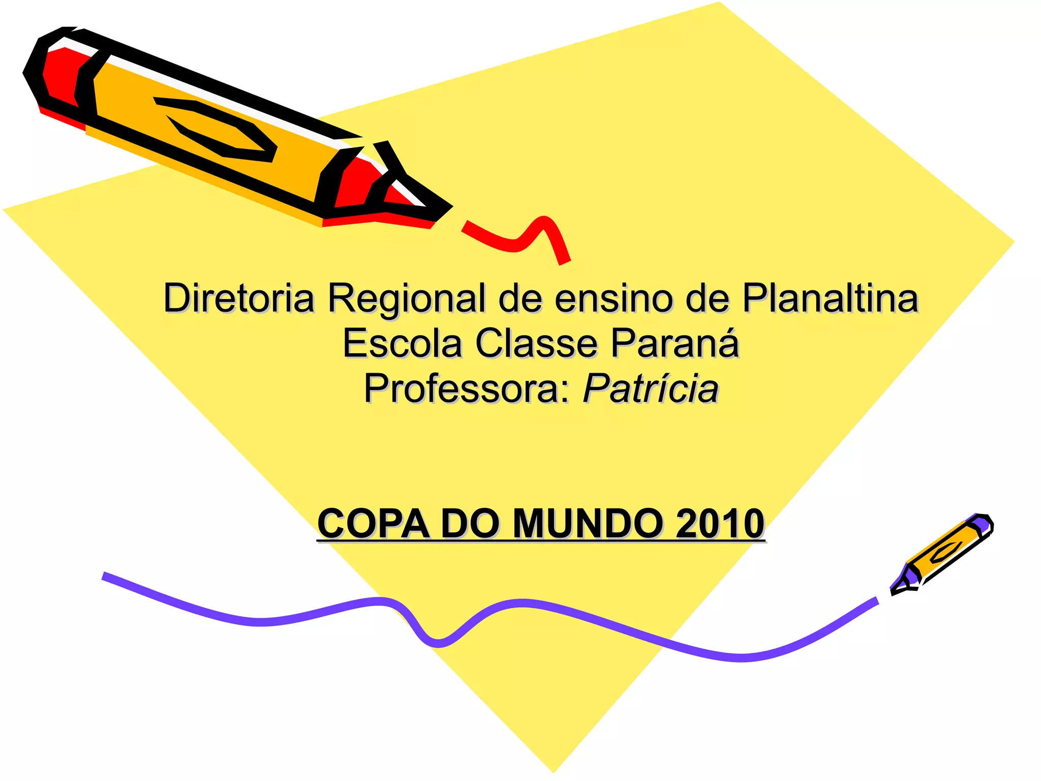 Este documento é um plano de aula para estudantes sobre a Copa do Mundo de 2010 na África do Sul. Contém 16 questões sobre diversas matérias como português, matemática, ciências, história, geografia, meio ambiente e artes relacionadas ao evento esportivo. Os alunos deverão pesquisar as respostas, criar uma capa ilustrativa e entregar o trabalho até 18 de junho de 2010.