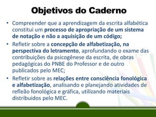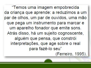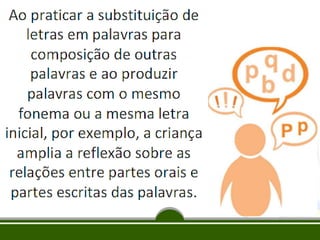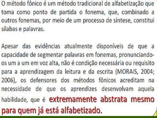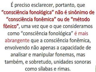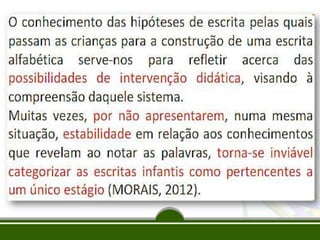 Este documento discute a apropriação do sistema de escrita alfabética por crianças, compreendendo que a alfabetização é um processo complexo e não a mera aquisição de um código. Ele também aborda a importância da consciência fonológica para a alfabetização e apresenta as etapas pelo qual as crianças passam para compreender o sistema de escrita: pré-silábico, silábico, silábico-alfabético e alfabético.