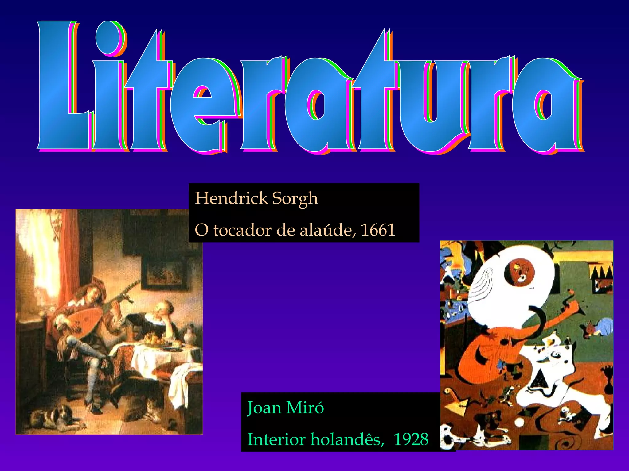 O documento apresenta uma lista de obras de arte e artistas, como Joan Miró e Hendrick Sorgh, seguida por breves considerações sobre subjetividade e percepção. Também discute o desenvolvimento da literatura a partir da comunicação prática para a expressão de ideias e sentimentos mais profundos.
