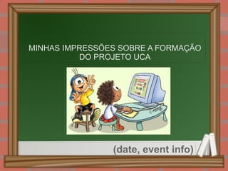 O documento discute as impressões de um aluno sobre a formação do Projeto UCA. Ele destaca os avanços como aprender técnicas do sistema operacional e socializar aspectos da aplicação do UCA na sala de aula. Sugestões incluem mais tempo para aulas, maior contextualização pedagógica e reduzir o tempo entre as aulas para maior interação com os formadores.