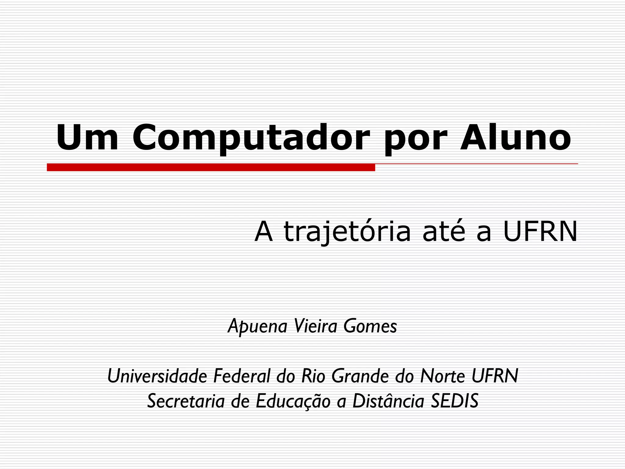 Este documento descreve o projeto Um Computador por Aluno (UCA) no Rio Grande do Norte, incluindo sua implementação na Universidade Federal do Rio Grande do Norte (UFRN). O UCA visa fornecer laptops educacionais para estudantes e professores para melhorar a educação pública. A UFRN está envolvida na formação de professores para o uso efetivo dos laptops em cinco escolas estaduais e quatro municipais selecionadas. Os principais desafios incluem melhorar a infraestrutura escolar e a formação contínua