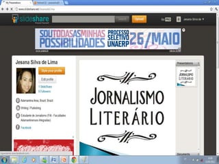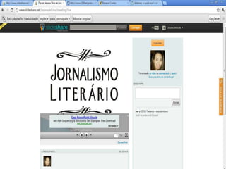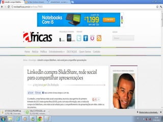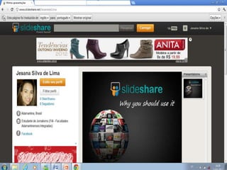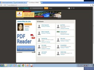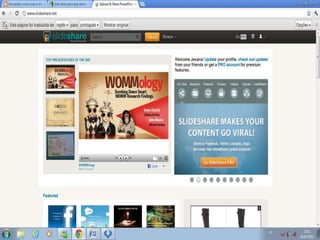 O documento descreve o Slideshare, um site de compartilhamento de apresentações e documentos com 60 milhões de visitantes mensais. O Slideshare permite que usuários carreguem, baixem e incorporem apresentações em blogs e sites, e também compartilhem em redes sociais. Ele é utilizado por profissionais, estudantes e empresas para pesquisa, atualização e divulgação de conteúdo.