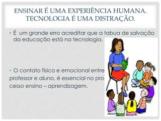 O documento discute os perigos da alienação educacional causada pelo excesso de tecnologia na educação. Ele argumenta que a educação deve valorizar a relação humana entre professor e aluno, e não substituir métodos tradicionais por distrações tecnológicas. A família também deve educar as crianças com princípios morais e não substituir interações por telas.