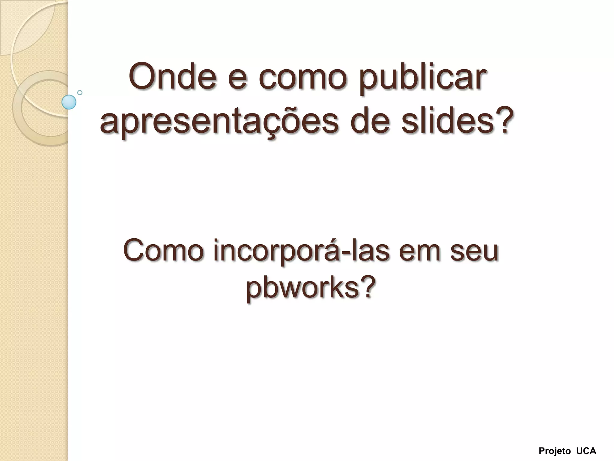 O documento explica como publicar apresentações no SlideShare e incorporá-las em outros sites como blogs e wikis. Ele descreve os passos de criar uma conta no SlideShare, fazer o upload de uma apresentação, preencher os metadados e publicá-la, e copiar o código de incorporação.