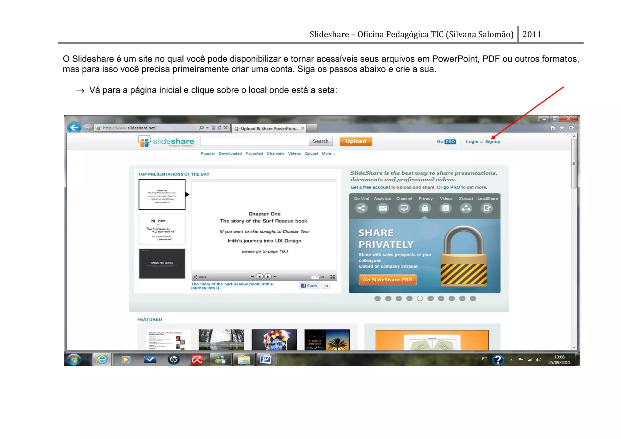 O documento fornece instruções passo-a-passo para criar uma conta no Slideshare, fazer o upload de arquivos, compartilhar o link com os alunos, e visualizar as apresentações online. Instruções incluem como preencher o cadastro, selecionar arquivos, adicionar metadados, configurar privacidade, incorporar em sites, e enviar notificações por email.