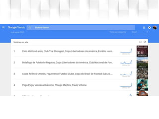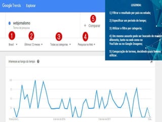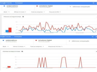 O Google Trends permite comparar termos de busca e identificar tendências para entender melhor o comportamento dos usuários. Ele filtra resultados por localização, categoria e fonte para ajudar jornalistas a escolherem palavras-chave que alcancem maior visibilidade. O uso da ferramenta permite ainda segmentar audiências e identificar sazonalidade em nichos.