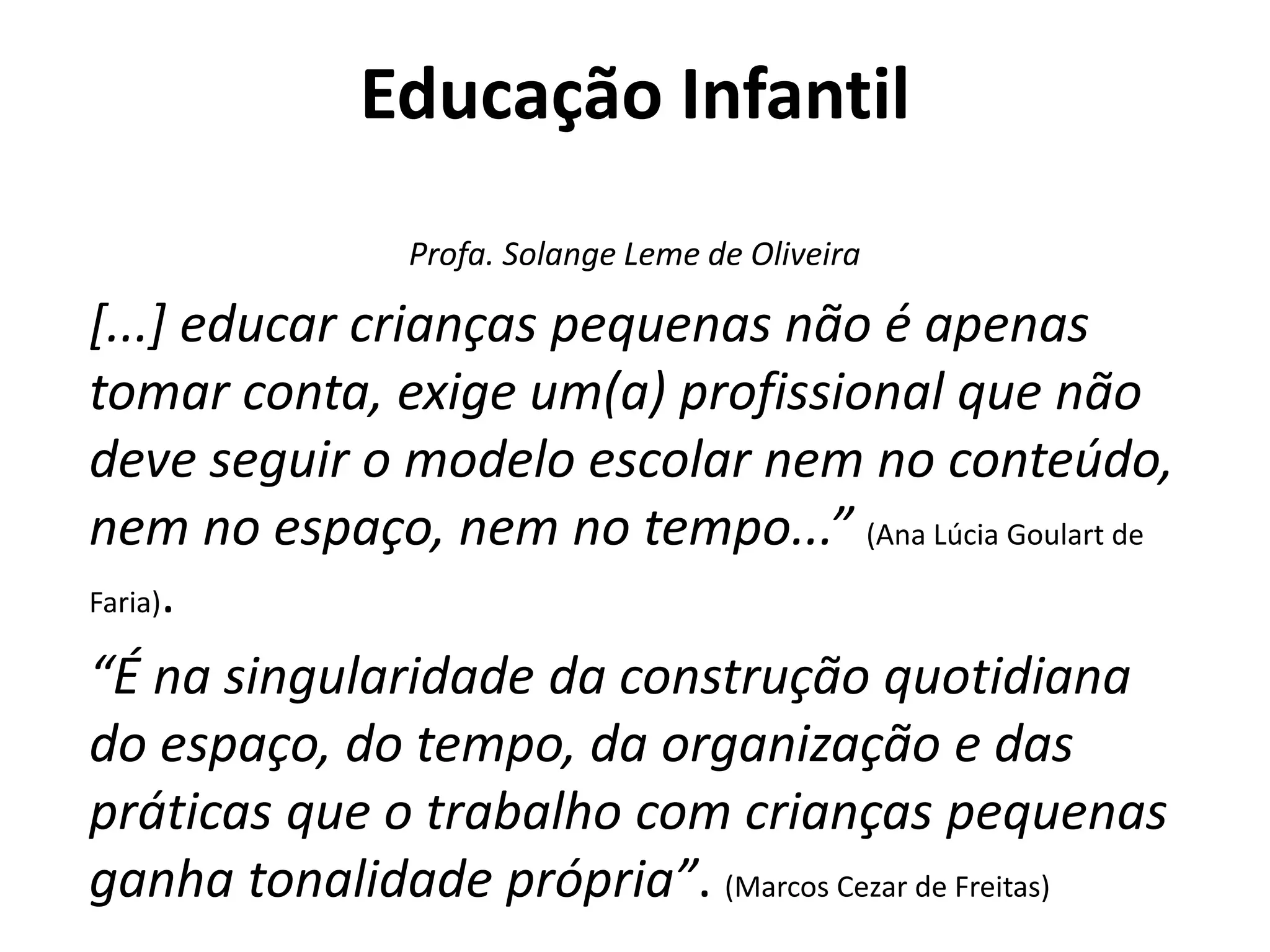 2) Os desafios atuais da educação infantil pública brasileira, como a falta de visibilidade da creche e a antecipação da escolarização.