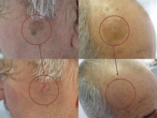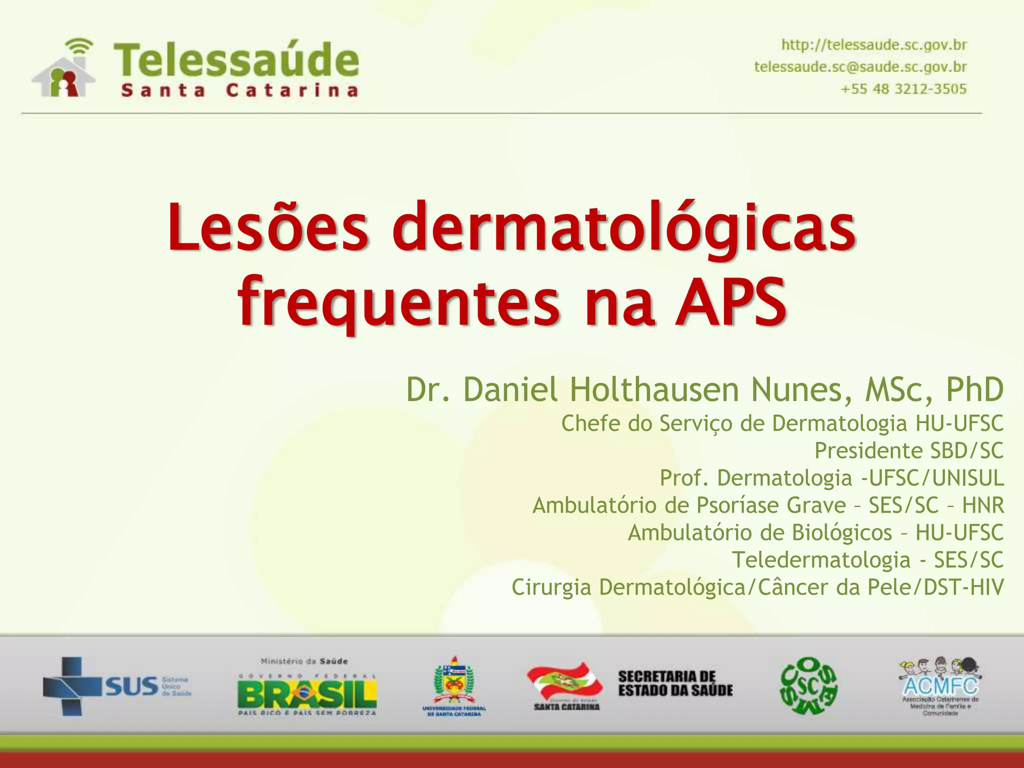 O documento apresenta dados estatísticos de exames dermatológicos realizados em 2014, com foco nos principais tipos de câncer de pele e lesões. A maioria dos casos eram lesões benignas como psoríase ou outras dermatoses. Cerca de 40% dos exames identificaram câncer de pele, principalmente carcinoma basocelular e espinocelular. O documento também fornece informações sobre prevenção, tipos de câncer de pele, sinais de alerta e fluxo de atendimento via teledermatologia