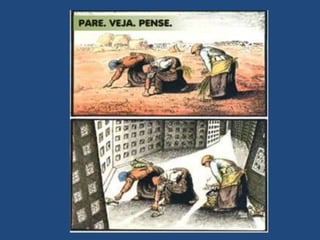 O documento discute o êxodo rural, que é o deslocamento da população rural para as cidades em busca de emprego e melhores condições de vida. A mecanização da agricultura substitui a mão de obra humana e pequenos produtores rurais têm baixa produtividade. Isso causa o aumento populacional desordenado nas cidades e problemas sociais.