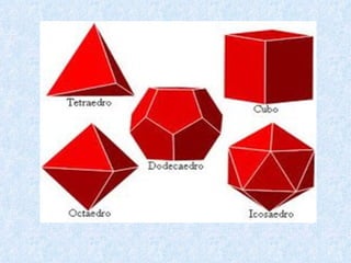 O documento discute os diferentes tipos de sólidos geométricos, divididos em poliedros e não poliedros. Os poliedros incluem figuras como cubos, pirâmides e prismas, cujas faces são polígonos. Os não poliedros como esferas, cones e cilindros têm pelo menos uma face curva. Exemplos comuns de cada tipo de sólido são dados, com suas características e elementos definidos.