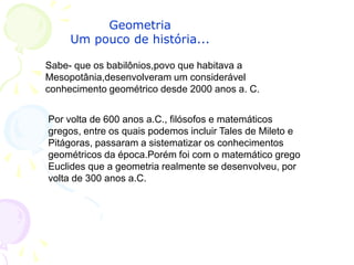 O documento discute a história da geometria, classificação de polígonos e sólidos geométricos. Apresenta exemplos de sólidos como prisma triangular, pirâmide triangular e cubo, mostrando suas características como número de vértices, arestas e faces.